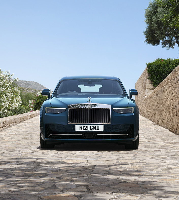Четкий монолитный профиль передней части привлекает внимание к культовой решетке радиатора Pantheon с подсветкой, которая по команде излучает божественное сияние. Низ передней части автомобиля украшен хромированными вставками, создающими "парящий" образ, передающий Дух Экстаза.