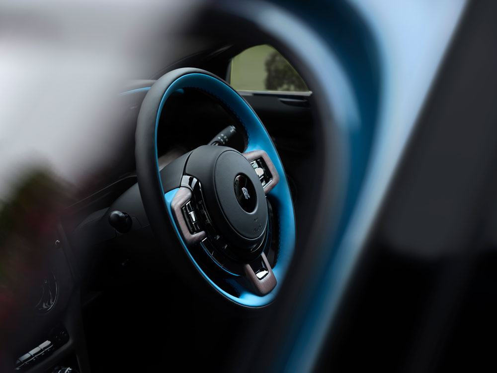 Задние фонари сзади украшены двумя выразительными вертикальными световыми панелями, украшенными изогнутым хромом, на которые нанесена монограмма Rolls-Royce с двойной буквой "R".