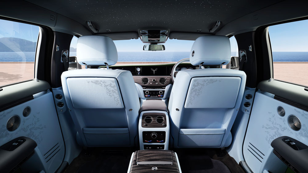 Водительское и пассажирское сиденья Ghost Series II Extended с заднего сиденья. светло-голубой интерьер. Здесь границы обычной жизни стираются. Где вы можете наслаждаться необыкновенными впечатлениями.