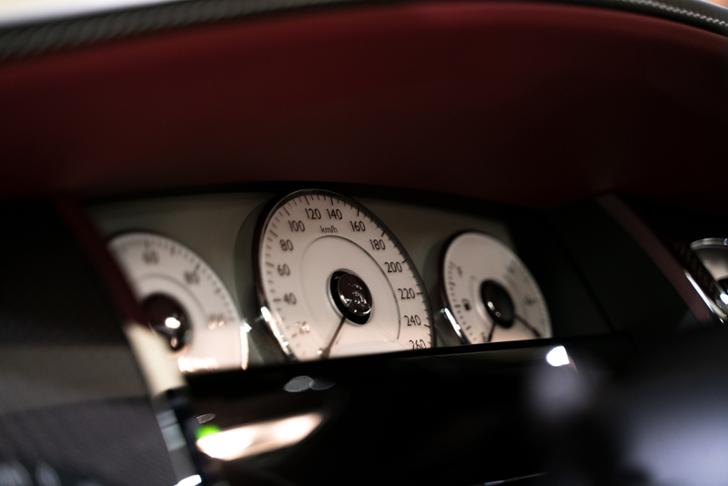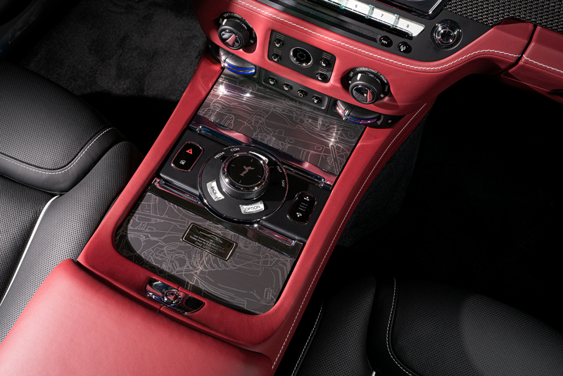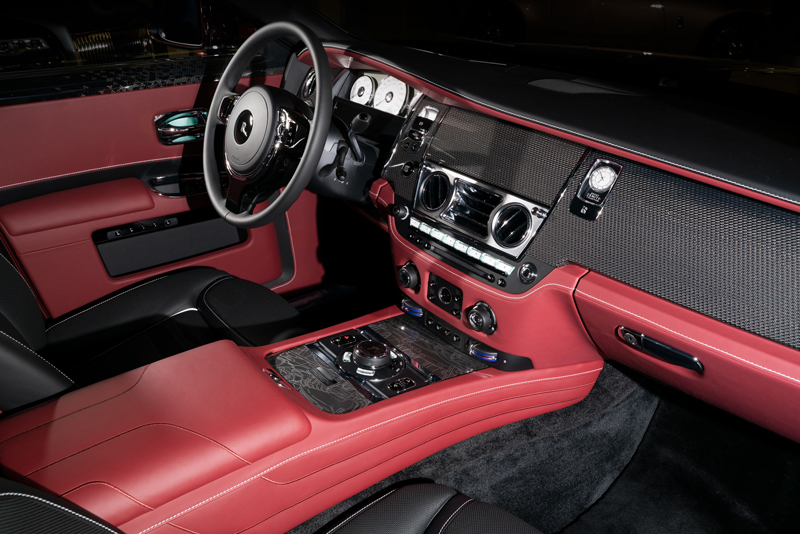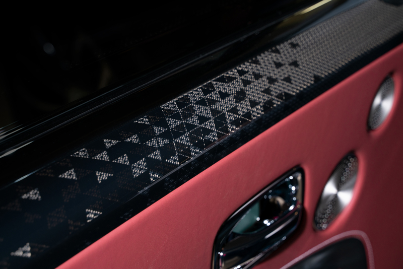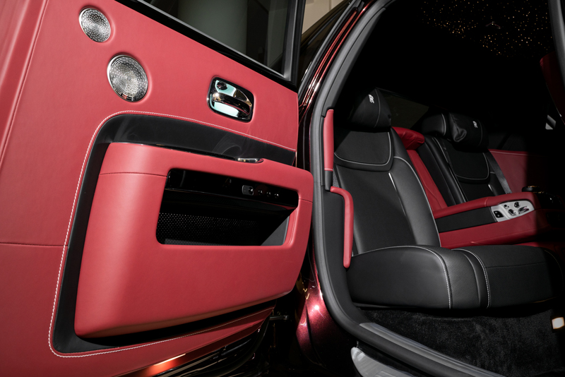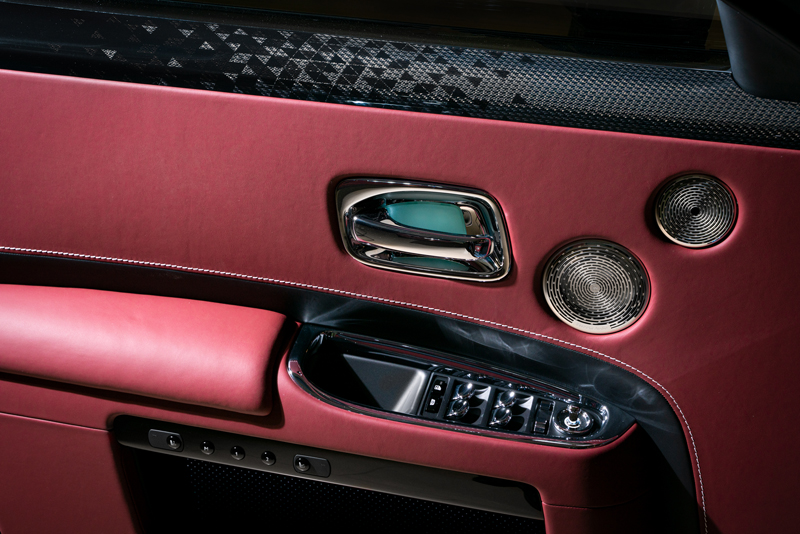 Эффектная иллюминация дверных карманов притягивает взгляды. Рассеянный свет, пропущенный через перфорированную кожу, подчеркивает элегантность интерьера Ghost. Отделка двери изящной инкрустацией в стиле маркетри – результат искуснейшей работы знаменитых мастеров по дереву. Инкрустацию можно заказать в разных вариантах отделки с использованием натуральной древесины, углеволокна или глянцевого шпона, покрытого рояльным лаком. Узор плавно переходит из водительской в пассажирскую зону, подчеркивая тем самым дуалистическую философию модели Ghost.