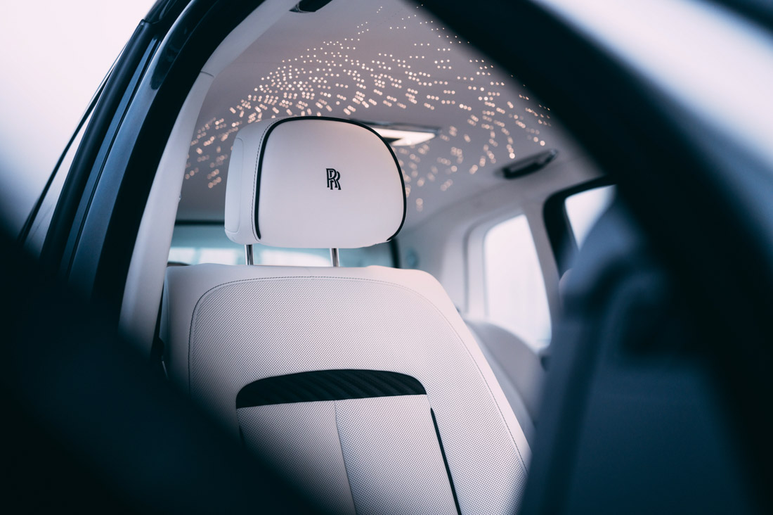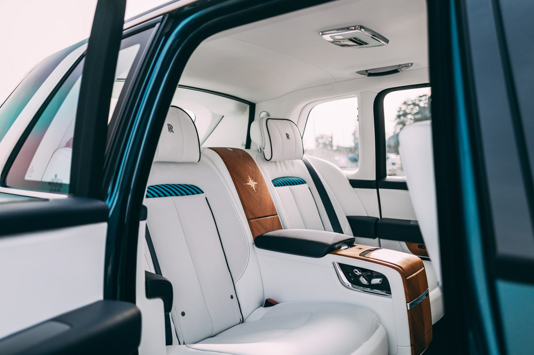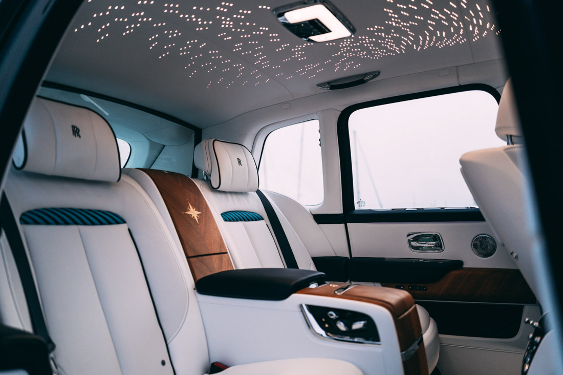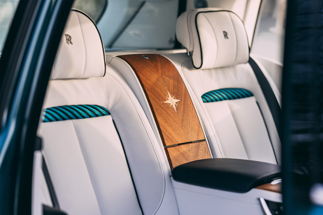 Интерьер отделан кожей арктического белого и темно-синего цвета, с контрастной строчкой, окантовкой и монограммами на подголовниках темно-синего цвета. Вставки сидений украшены узором, имитирующим такелаж, вышитым вручную диагональными полосами фирменной нитью Rolls-Royce. Созданный мастером, лично связанным с Королевским флотом и обученным работе с пряжей, плетению и вышивке, этот элемент тщательно продуман, чтобы перекликаться с переплетением канатов, где множество нитей скручиваются вместе для создания прочности. Направление каждого стежка отражает эту структурную композицию, элегантно перенося искусство работы с морскими канатами в вышивку. Мотив каната также присутствует на подсвечиваемых накладках на пороги, видимых при открытии дверей салона.