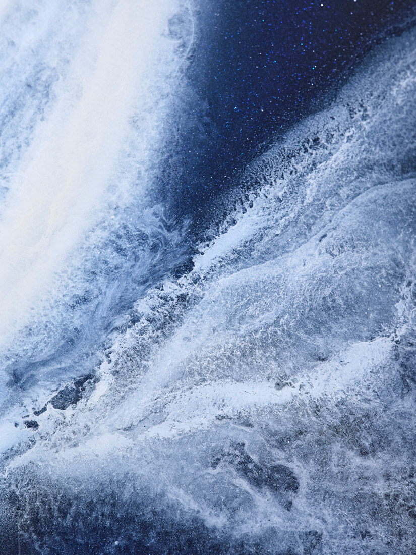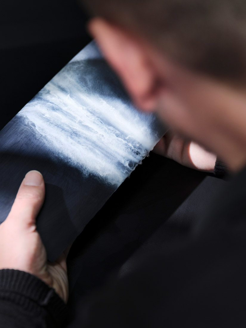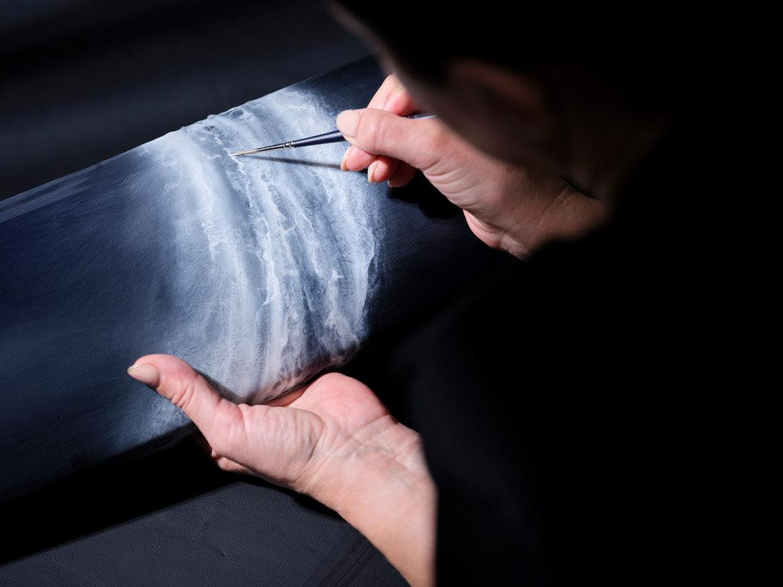 Разработка композиции потребовала двух месяцев экспериментов, в ходе которых были отточены сочетания оттенков краски, техники нанесения и процессы лакирования. Для достижения реалистичного волнообразного эффекта пигмент наносится аэрографом на влажный лак, после чего формируется вручную тонкой кистью. Направляя поток воздуха по поверхности и вручную управляя краской, художник добивается естественного ощущения движения.