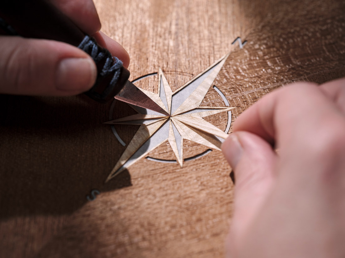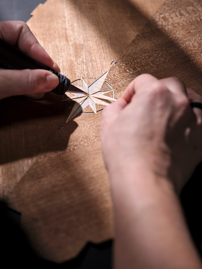 На задней части столешницы, выполненной в форме водопада, центральное место занимает инкрустированный мотив компаса. Каждый элемент дизайна состоит из более чем 40 отдельных деталей из шпона клена, тика, ясеня и черного боливара, точно вырезанных и собранных вручную.