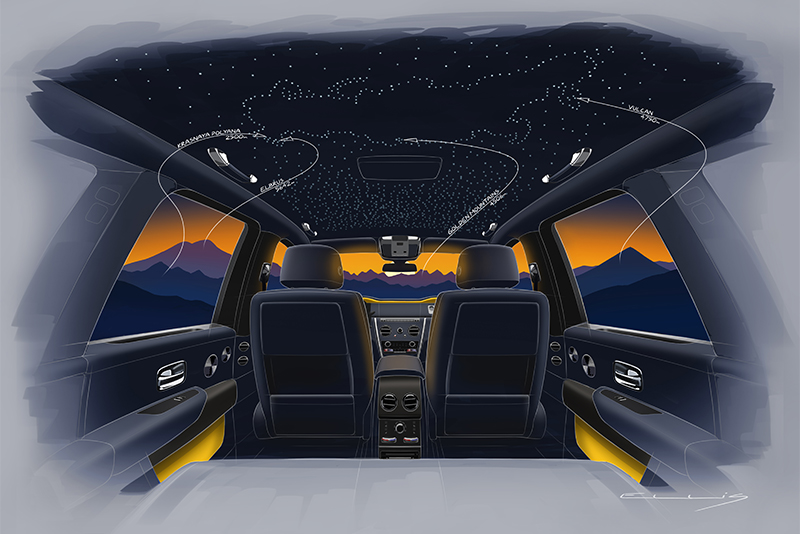 Переднюю панель украшает изображение Ближнего Востока с высоты спутника, а на «звёздном небе» появилась вышивка всех планет Солнечной системы. Среди других элементов от Bespoke – накладки на пороги, часы с металлическим циферблатом, а также инкрустация передней панели изображением всех планет в серебре, а Земли – в золоте.