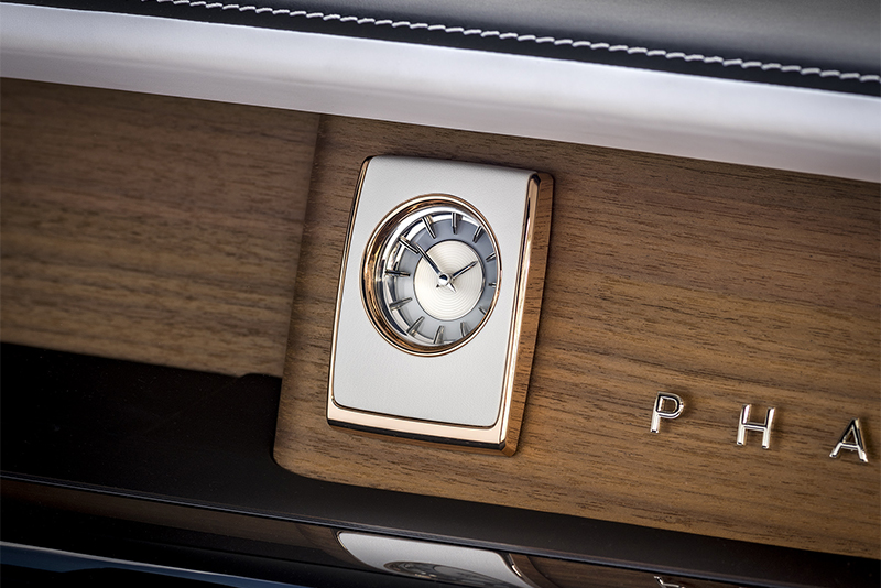 Сочетание черной кожи в салоне и позолоты из розового золота, которой покрыты решётки динамиков аудиосистемы Bespoke и корпус часов на передней панели Phantom, передает контраст последних лучей заходящего солнца на стеклянных стенах и длинных теней, которые отбрасывают высотные здания.