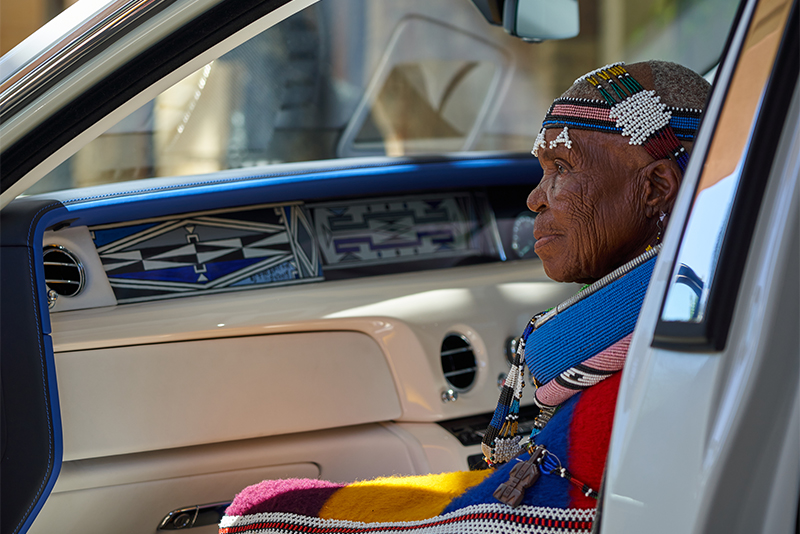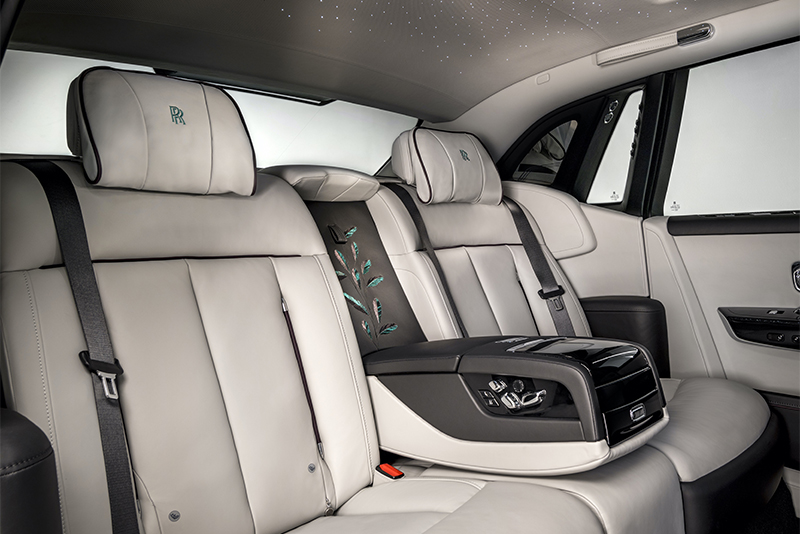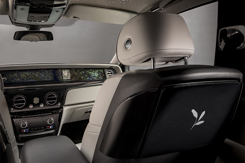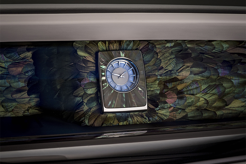 Перья вручную вшиты в полотно и эффектно сочетаются с инкрустированным перламутром обрамлением часов в центре панели, образуя единую композицию. Интерьер автомобиля дополняют вышивка заднего сиденья и инкрустированные перламутром столики.