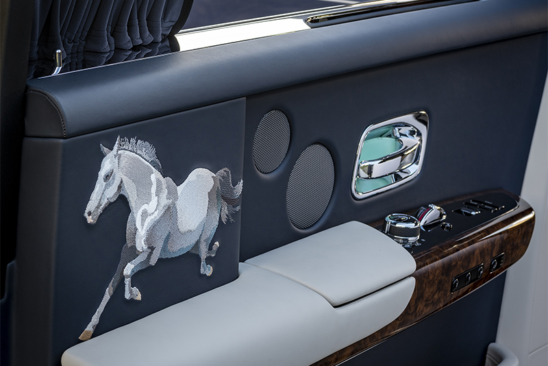 Сложная вышивка от Bespoke с изображением жеребца украшает дверные панели этого элегантного Phantom. Вышивка коня, олицетворяющего силу и стремление к прогрессу, была разработана командой Bespoke на основе эскиза, представленного китайским клиентом.