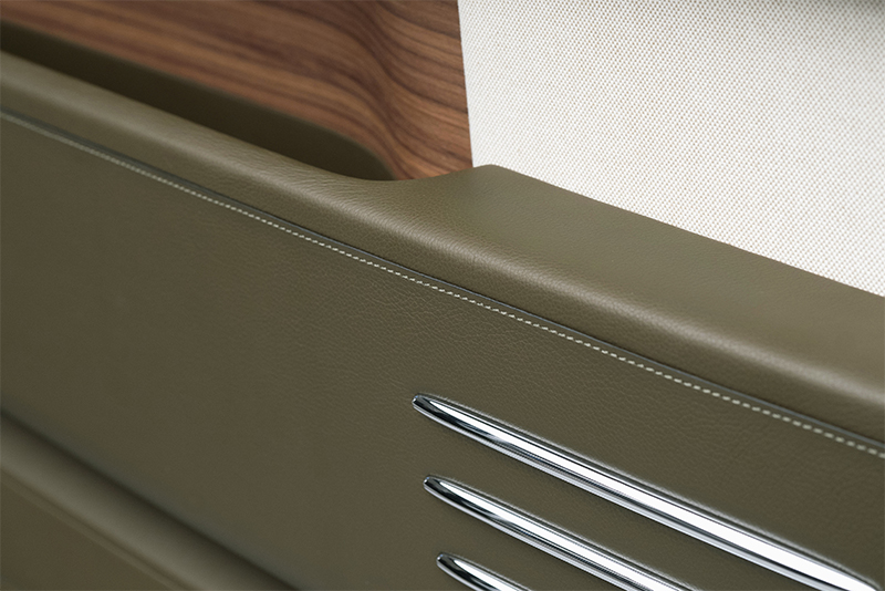 Подголовники и мягкие опоры для ног на заднем сиденье отделаны кантом Hermès. Белые акценты и коврики из овечьей шерсти цвета морской раковины создают ощущение пространства и света в салоне.