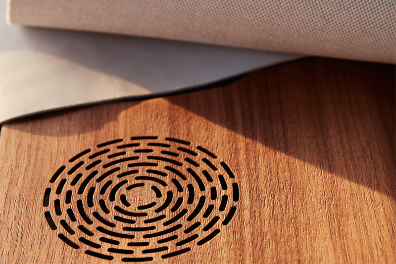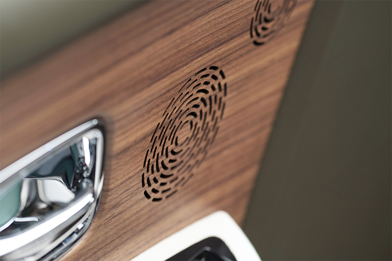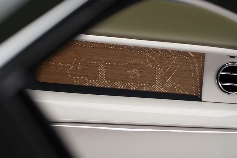 Интерьер украшают и узнаваемые детали от Rolls-Royce Bespoke. К примеру, сетки динамиков изготовлены из дерева королевского ореха с открытыми порами и встроены в обивку дверей – для этого дерево было тщательно перфорировано, что позволило создать бесшовную, текстурированную поверхность. Этот же сорт дерева использован для отделки центральной и задней консолей, а также откидных столиков. Тканью от Hermès с узором ‘Toile H’ обиты дверные подлокотники, центральная и задняя консоли и потолок автомобиля.