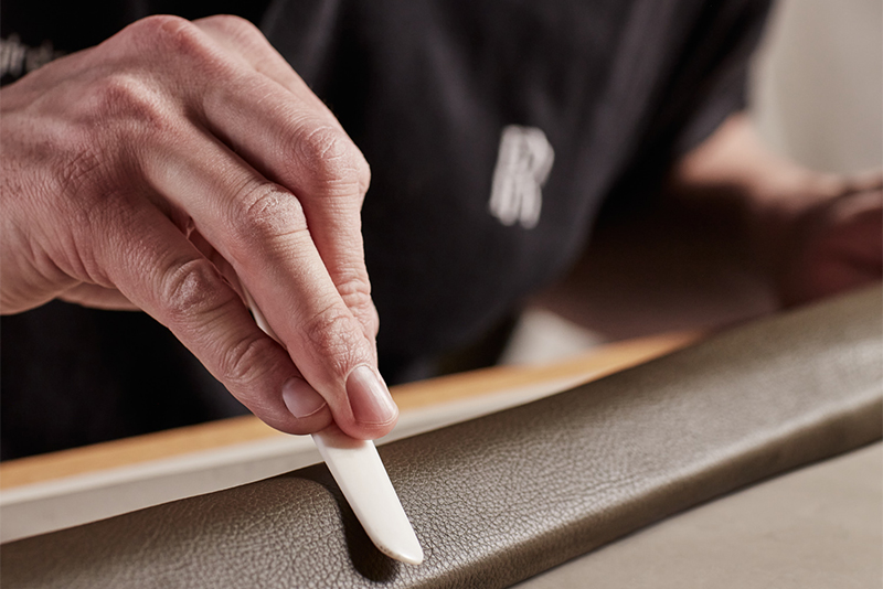 Салон отделан по большей части кожей от Hermès, в особенности ключевые поверхности, которых касается клиент, – к примеру, рулевое колесо, силовые поручни, рычаг переключения передач и органы управления климат-контролем. Кожей от Hermès также обиты верхняя часть передней панели, подлокотники, полка багажника, бардачок и багажный отсек, центральная консоль, отделение для декантера и охлаждаемый отсек для игристого. В знак коллаборации и взаимного уважения двух команд крышку бардачка украсили тисненой надписью Habillé par Hermès Paris.