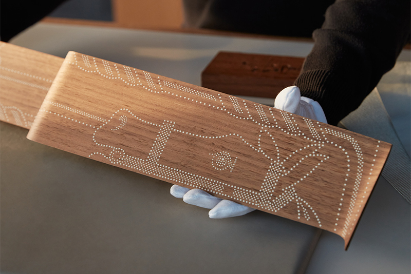 Конное наследие Hermès нашло отражение в салоне этого автомобиля: кожаная обивка создана с использованием стежков и техники окрашивания краев, которая первоначально применялась мастерами-седельниками. В галерее Phantom – витрине в передней панели – размещена заказанная Hermès композиция по мотивам работ известного французского художника и иллюстратора Пьера Перона (1905–1988), который по заказу Hermès создал множество легендарных узоров для шарфов. Эта композиция, вдохновлённая знаменитыми конными мотивами Hermès, нарисована на дереве королевского ореха с открытой порой.