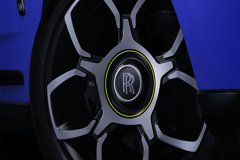 На необычную расцветку Cullinan Black Badge команду Bespoke Collective вдохновил окрас экзотической бабочки вида Rhetus periander. Известный своим оттенком глубокой синевы с металлическим блеском этот вид бабочек встречается в Центральной и Южной Америке. Яркий цвет их крылышек точно передан в оттенке Mirabeau Blue. Особый контраст создаёт белоснежный кожаный салон Arctic White с элементами зелёного Lime Rock Green.
