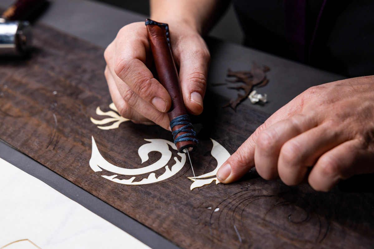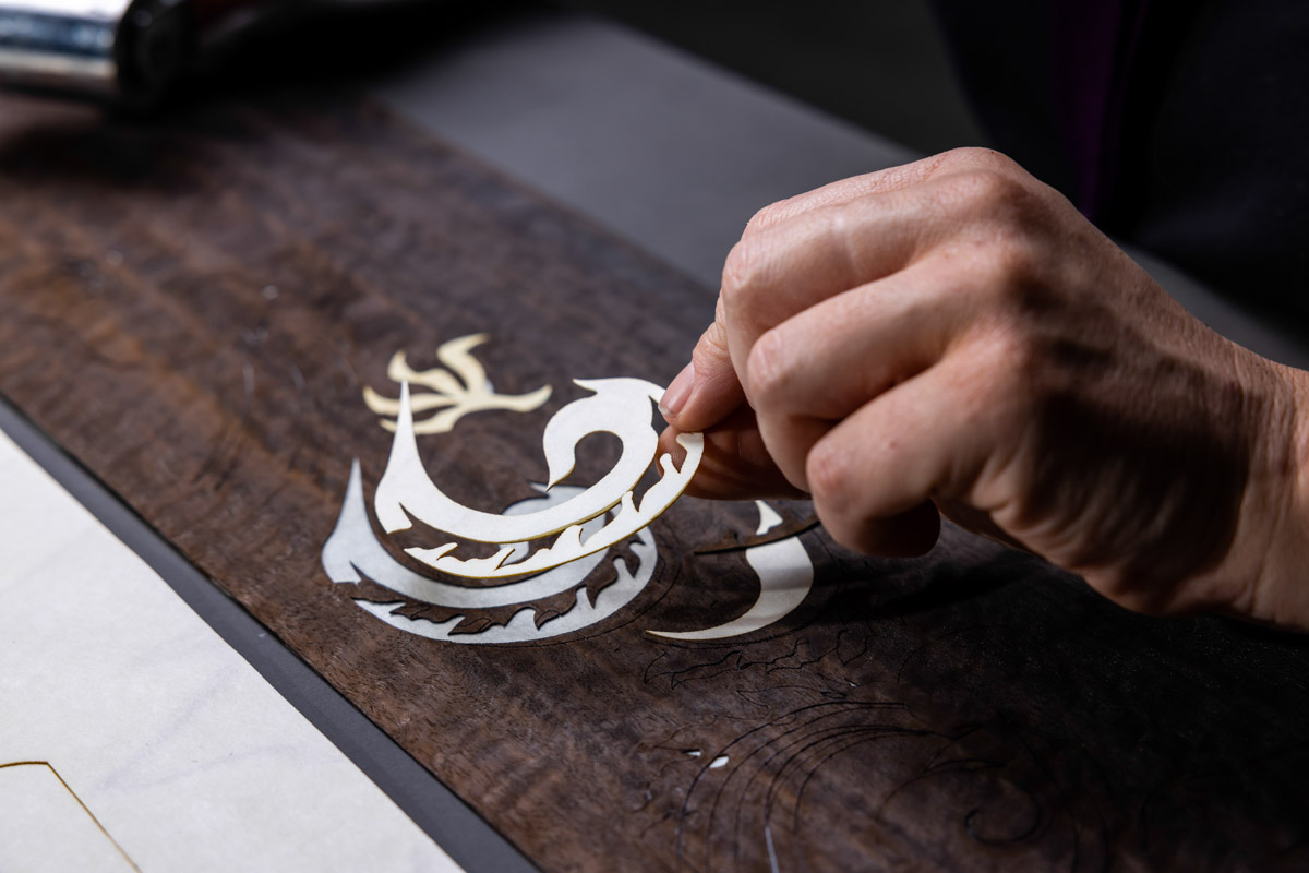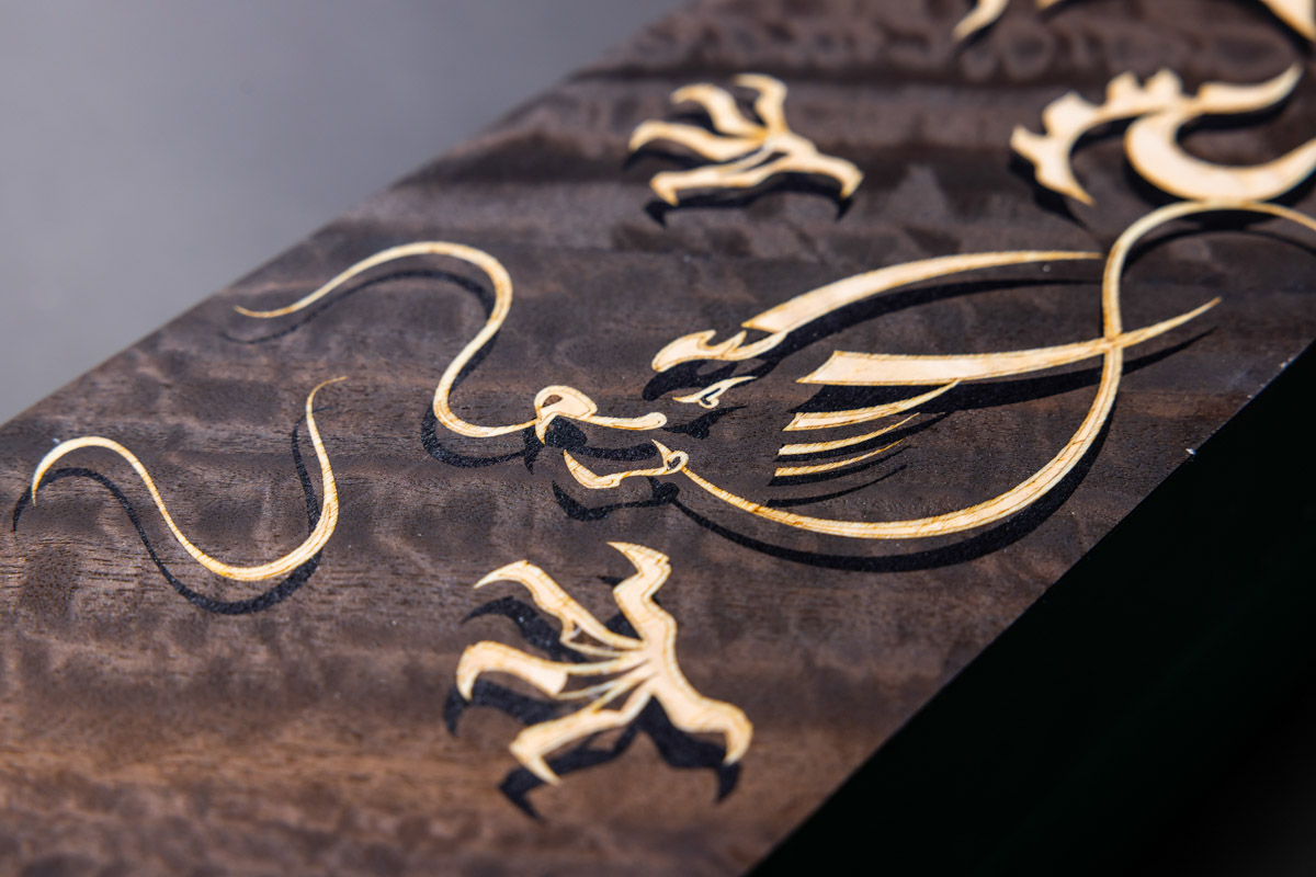 В галерее, которая занимает всю ширину фасада, представлена маркетри Bespoke, выполненным из 297 отдельных элементов и четырёх различных пород дерева. Мастер из Дома Rolls-Royce потратил три месяца на создание этого поразительного элемента, который включает в себя сложную вырезку фигур из шпона, а затем их ручную сборку и крепление. Произведение искусства представляет собой двух драконов, заключённых в клубящиеся облака, которые охраняют жемчужину, олицетворяемую самими часами Bespoke. Основа выполнена из копчёного эвкалипта; контуры фигур шириной всего 0,5 мм выполнены из шпона платана и заполнены капом ясеня, тщательно отобранного за его естественную текстуру, имитирующую текстуру облаков. «Тени» шпона чёрного боливара придают изделию ощущение глубины, создавая впечатление, что драконы парят над поверхностью.