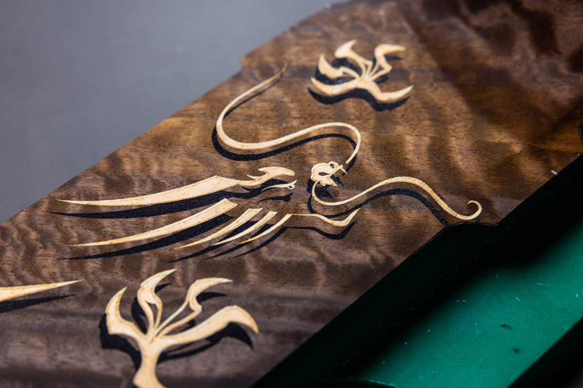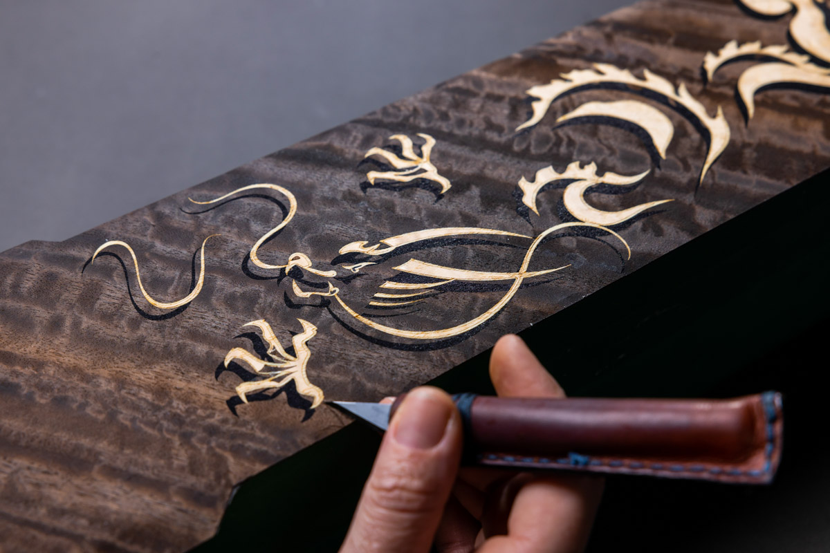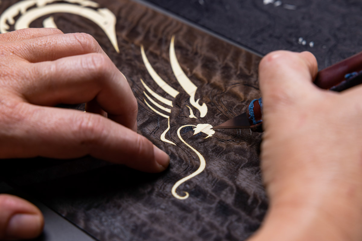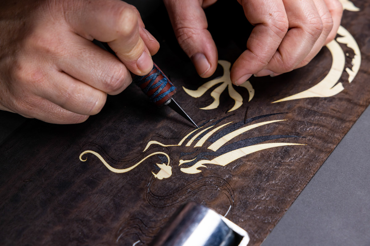 В галерее, которая занимает всю ширину фасада, представлена маркетри Bespoke, выполненным из 297 отдельных элементов и четырёх различных пород дерева. Мастер из Дома Rolls-Royce потратил три месяца на создание этого поразительного элемента, который включает в себя сложную вырезку фигур из шпона, а затем их ручную сборку и крепление. Произведение искусства представляет собой двух драконов, заключённых в клубящиеся облака, которые охраняют жемчужину, олицетворяемую самими часами Bespoke. Основа выполнена из копчёного эвкалипта; контуры фигур шириной всего 0,5 мм выполнены из шпона платана и заполнены капом ясеня, тщательно отобранного за его естественную текстуру, имитирующую текстуру облаков. «Тени» шпона чёрного боливара придают изделию ощущение глубины, создавая впечатление, что драконы парят над поверхностью.