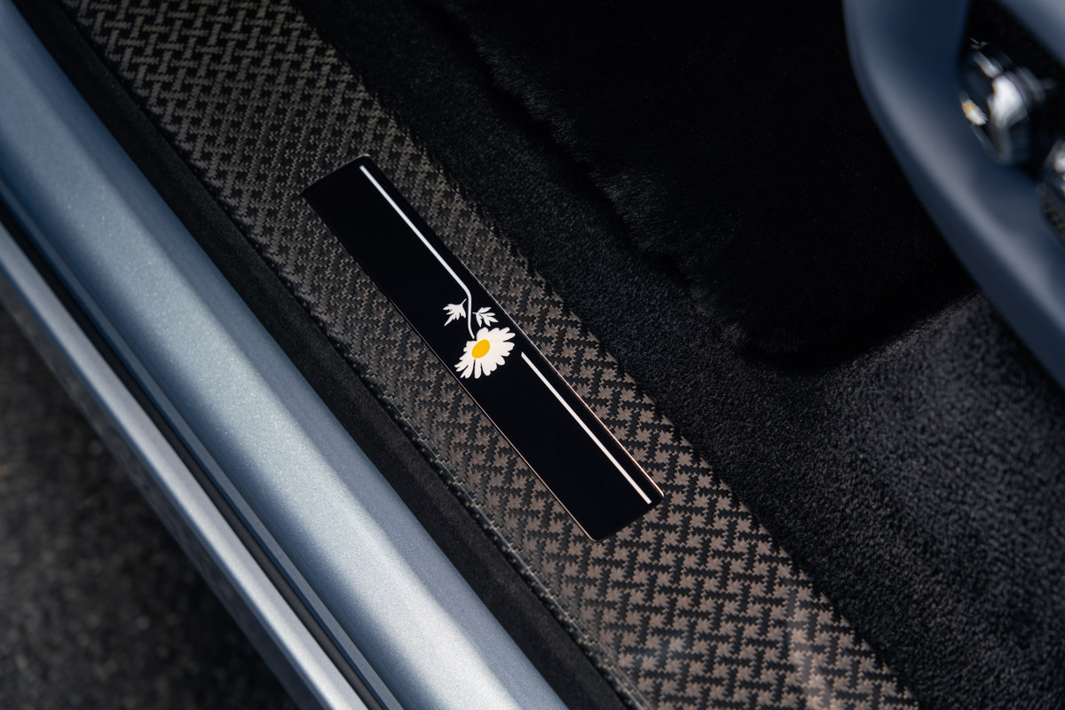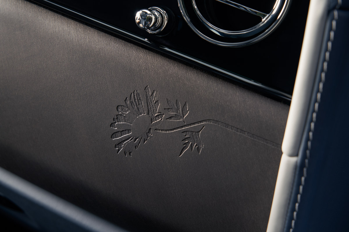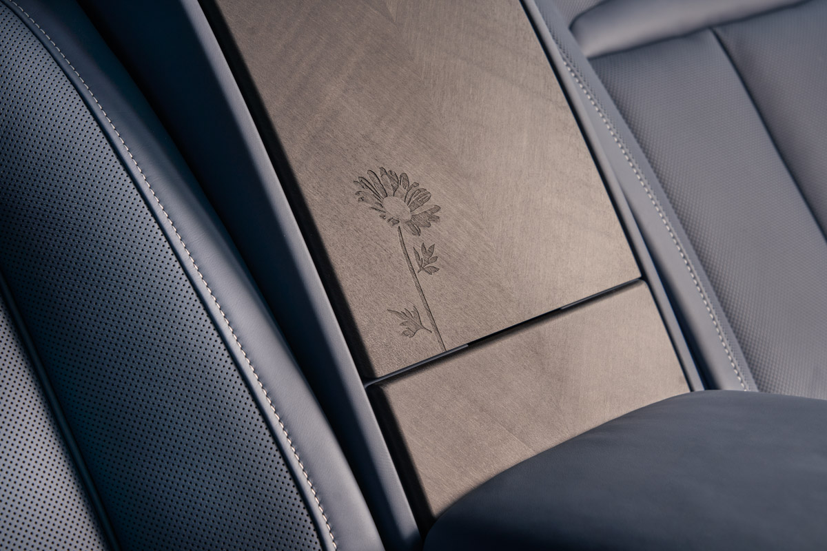 Внутри узор в виде ромашек украшает переднюю панель и каскадную зону между задними сиденьями. Рисунок кропотливо наносится на поверхность Blackwood с помощью пескоструйной обработки. Для создания рисунка древесина подвергается высокоточной дробеструйной обработке, при которой на шпон направляется поток мелких минеральных частиц, которые деликатно удаляют микроскопические слои поверхности. Игра света и тени на скульптурной поверхности создаёт трёхмерный эффект, добавляя визуальной выразительности готовому изделию.