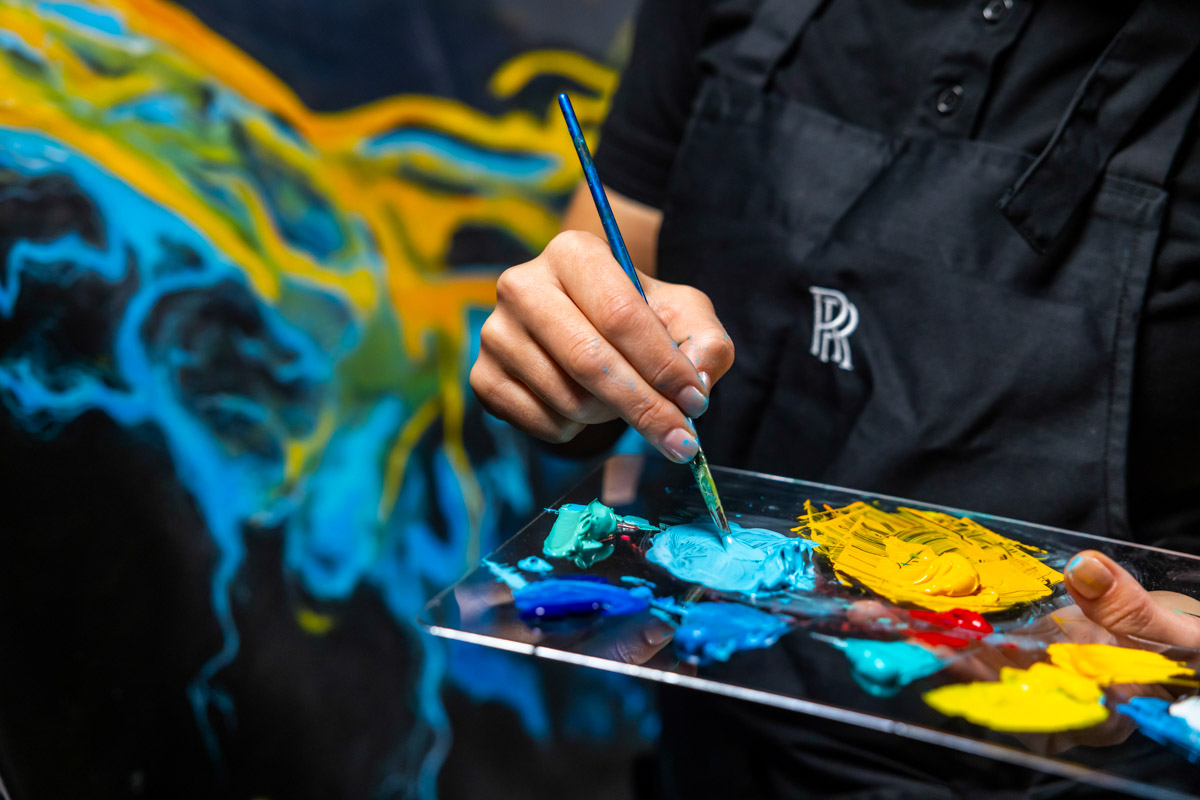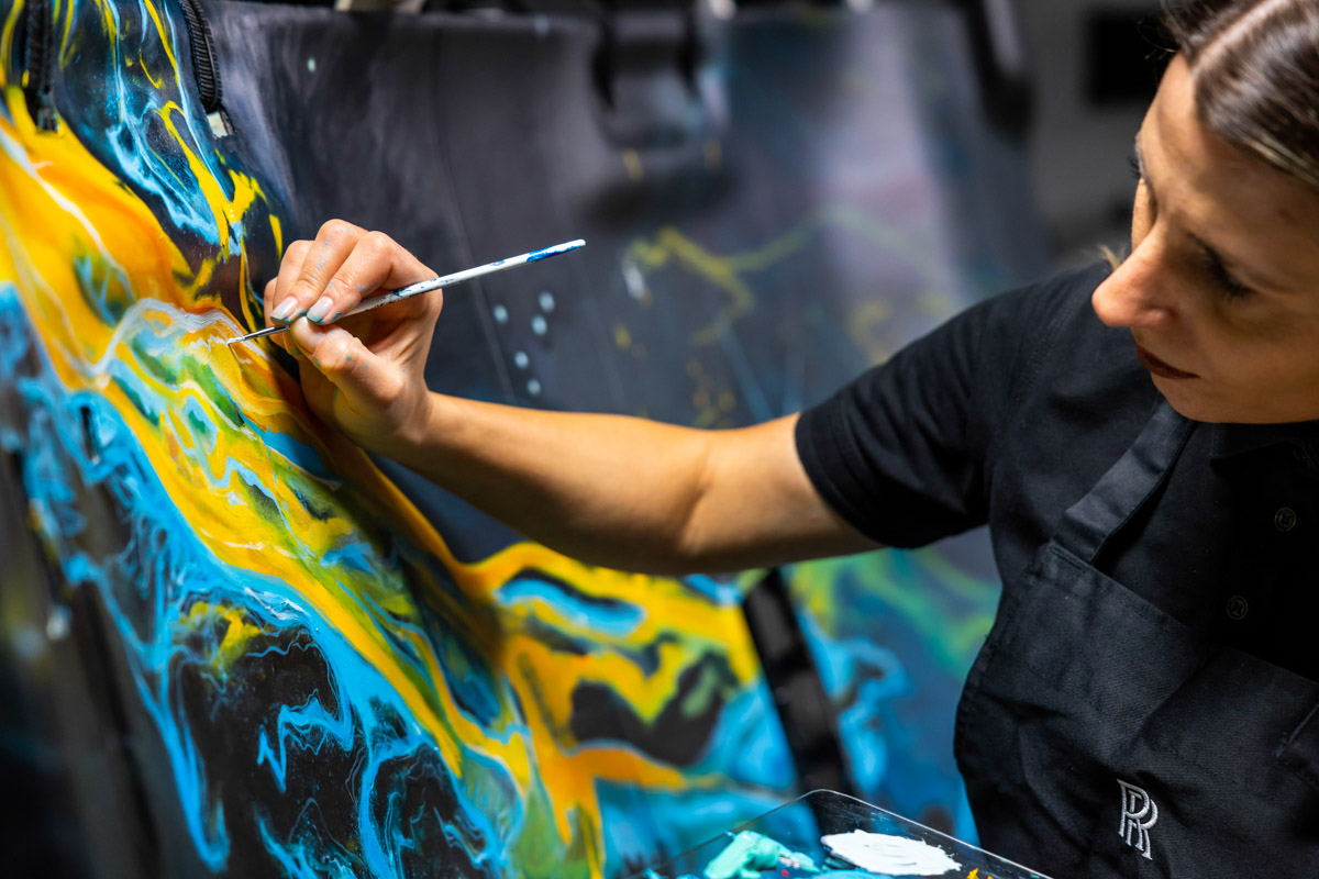 Мерцающее поле нарисованных «звёзд» было создано с помощью сочетания тонких заострённых кистей и техники краппинга, что придало финальной композиции органичный, небесный вид. Только после того, как роспись на потолке Starlight Headliner была завершена и запечатана, оптоволоконные отверстия были пробиты и размещены вручную, чтобы дополнить контуры произведения искусства.