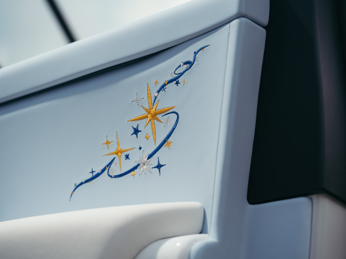 Заказчики работали с дизайнерами Rolls-Royce над созданием уникального мотива «Звездное скопление», который отображается в виде вышивки Bespoke на дверных панелях и подголовниках, а также в виде нарисованного вручную произведения искусства на панели приборов переднего пассажира.