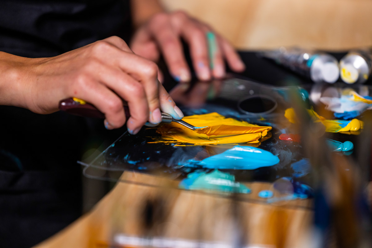 Для создания светящихся облаков художница использовала более 20 последовательных слоёв акриловой краски, создавая глубину и объём с помощью различных кистей. Чтобы добиться эффекта тумана, художница обратилась к неожиданному инструменту – кисточке для макияжа, – чтобы самый тонкий слой пигментов деликатно высох при соприкосновении с кожей.