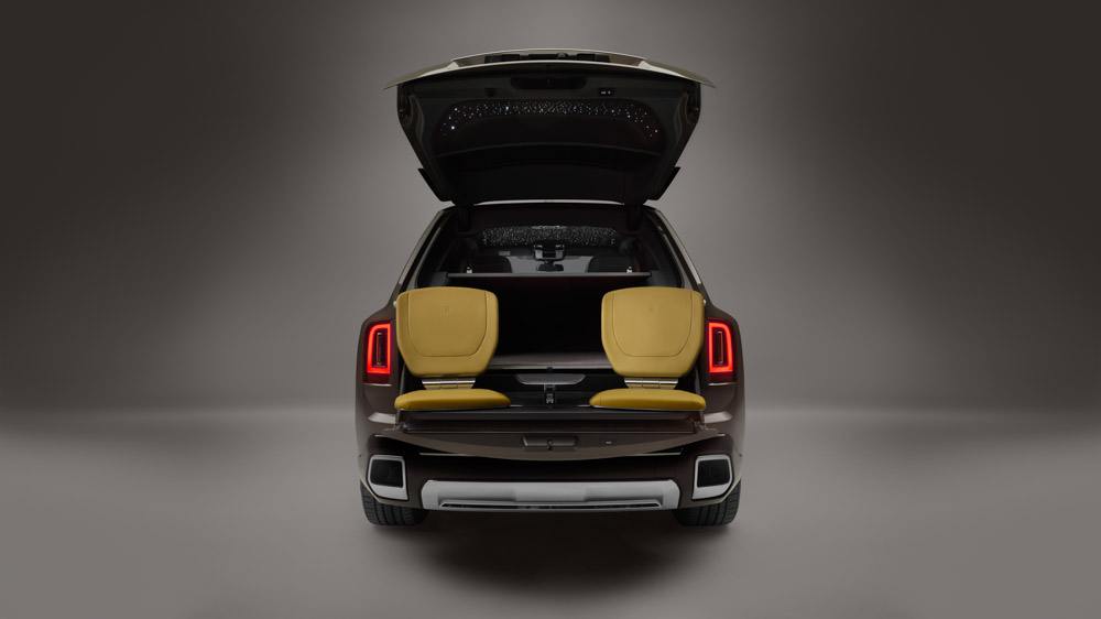 Сзади выхлопная система Cullinan Series II — это смелое заявление о мощи: каждая окантовка выполнена из зеркальной нержавеющей стали, аккуратно интегрирована и визуально плотно прилегает к кузову. Изменения в задней части автомобиля завершаются защитной пластиной из матовой нержавеющей стали, расположенной между выхлопными трубами и проходящей под днищем автомобиля.