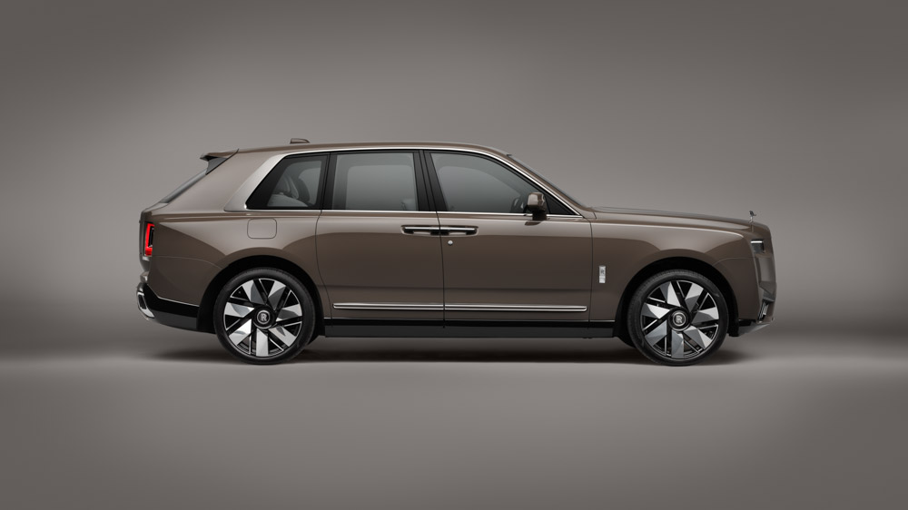 В профиль Cullinan Series II демонстрирует дальнейшие изменения в отделке. Хотя передние крылья сохранили свои чёткие вертикальные линии, дизайнеры марки добавили сдержанную, но чёткую характерную линию, идущую от заднего фонаря к центру плавающих центральных колпаков «RR» на заднем колесе. Это создаёт лёгкий изгиб и ощущение движения, которое ещё больше усиливается обновлёнными нижними фартуками, приподнимающимися в задней части. Они выполнены в насыщенном глянцево-чёрном цвете, который отражает дорогу внизу, создавая ощущение движения на этих неподвижных формах.