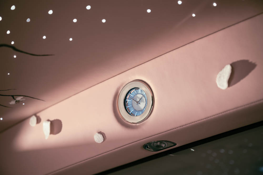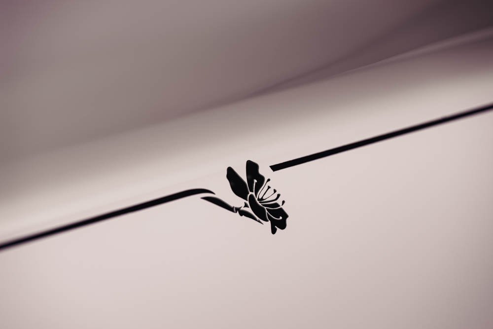 Продолжая тему ханами, мотив падающих лепестков украшает внутреннюю обивку зонтов Bespoke, спрятанных в дверях автомобиля. Внешний вид автомобиля также тонко отсылает к теме: кузов цвета «Кристалл над арктическим белым» отличается характерной ручной росписью, которая элегантно сужается посередине задней пассажирской двери и украшена нежным мотивом цветущей вишни — элегантным предвестником мастерства, проявленного в интерьере.