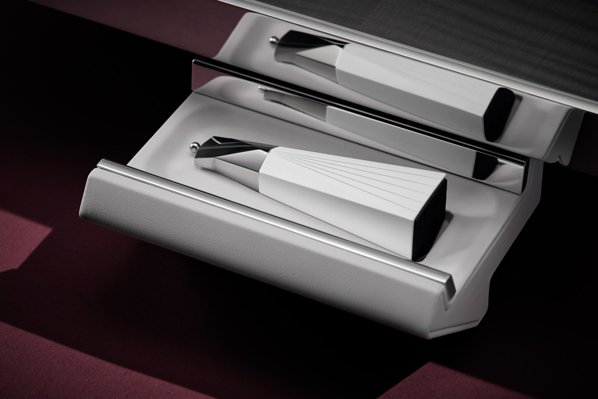 Каждая шахматная фигура изготовлена с точностью и имеет гранёные поверхности, что превращает их в самостоятельные скульптурные объекты. Для создания фигур дизайнеры марки изучили профиль традиционных шахматных фигур, выдавив их вниз, образуя квадратные основания. Каждая из этих скульптурных фигур изготовлена из алюминия с керамическим покрытием, содержит скрытый магнит и увенчана полированной головкой из нержавеющей стали, напоминающей драгоценный камень.Их вес, прочность и прохладная на ощупь тактильная чувствительность намеренно напоминают цельнометаллические регистры органов, используемые в автомобилях Rolls-Royce.— общее выражение материальной аутентичности и приятного механического взаимодействия. Чёрные шахматные фигуры имеют сатинированную отделку, а белые — лёгкий переливающийся эффект.